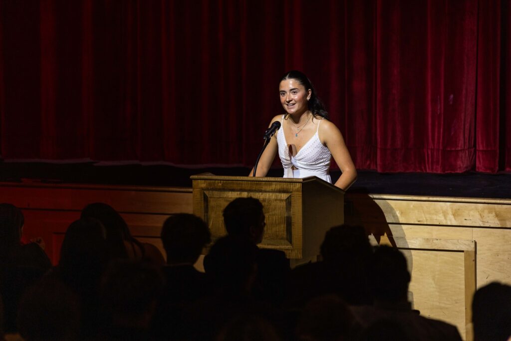 Luna described her childhood growing up on New Hampton School’s campus, expressing that her home wasn’t just a home—it was a whole campus that was her entire world. But as she grew and entered high school, her home felt different and began to shift. She learned that her dad was leaving New Hampton during the spring of her sophomore year, and she began to process how this would change her relationship to the campus as the family moved to a new home. Now as a day student, Luna found her way back to belonging over time through her connections here in the community. “Now as a senior I understand that home is not fixed, it’s not permanent. It’s a collection of memories and moments and the people who shape who we are.”